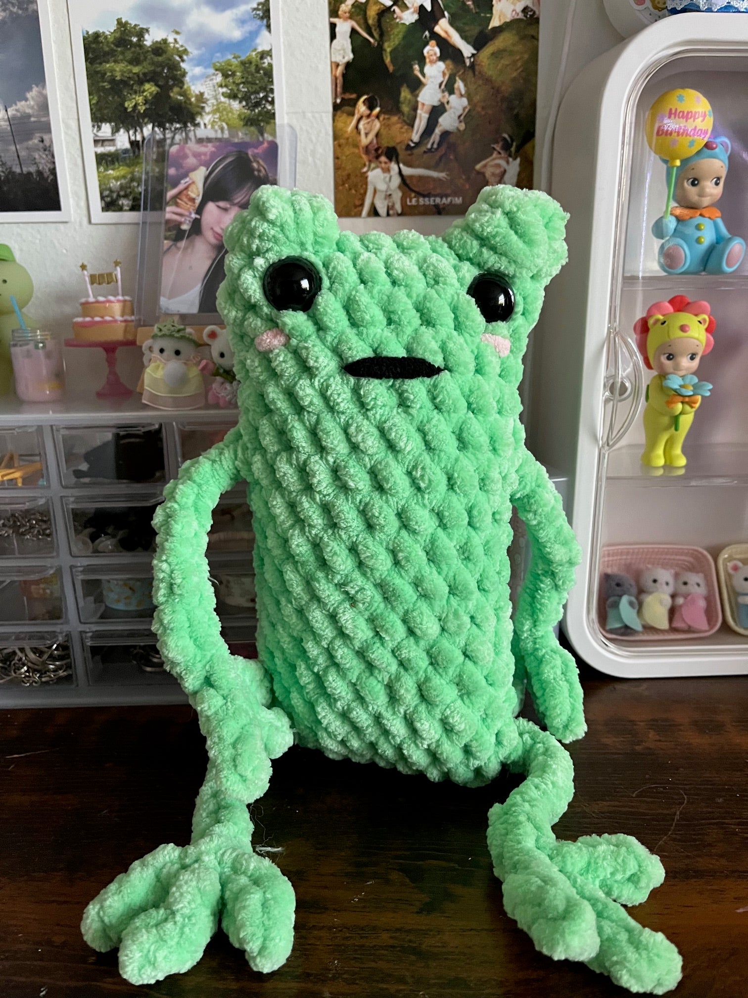 Extra-Large crochet leggy frog plushie.